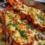 French Lobster Thermidor Cream is a decadent seafood dish featuring tender lobster meat in a rich cream sauce, topped with Parmesan cheese and broiled to perfection.