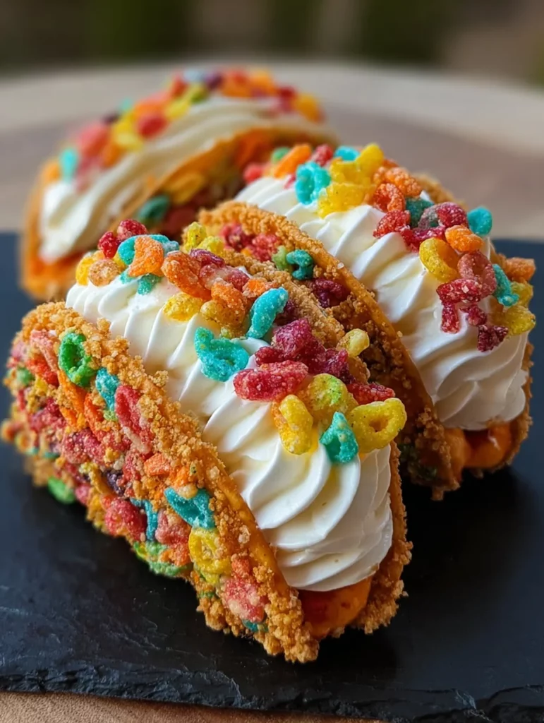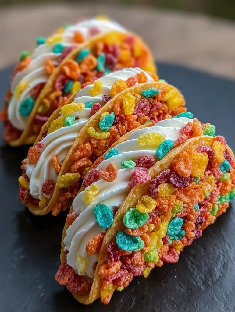 Sprinkle additional fruity cereal over the filled taco shells for that extra pop of color and crunch.