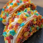 A fun and delicious dessert that combines the flavors of Fruity Pebbles and cheesecake in a taco-shaped treat.