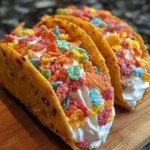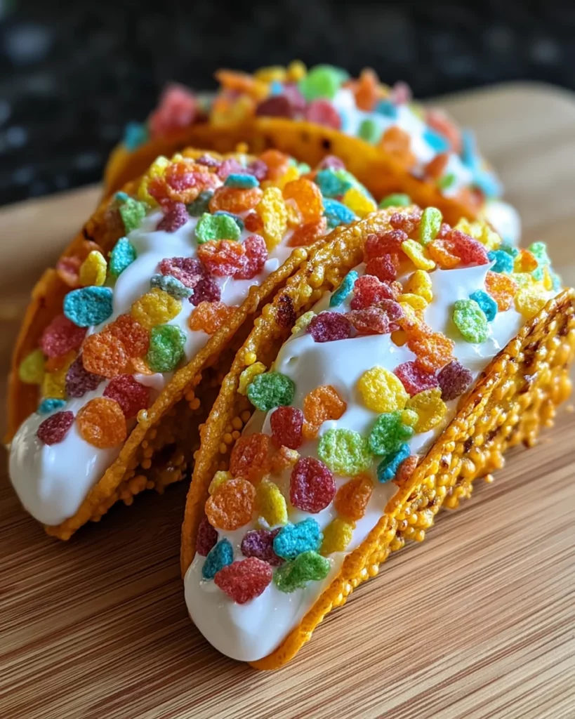 Finally, top off each taco with additional fruity cereal. Sprinkle it on gently, pressing little bits into the filling to help it stick. If you’re feeling fancy, serve them immediately for maximum crunch. Or, if you want to make them ahead, refrigerate them for up to 2 hours before serving. Just remember, the sooner you serve, the crunchier they stay!