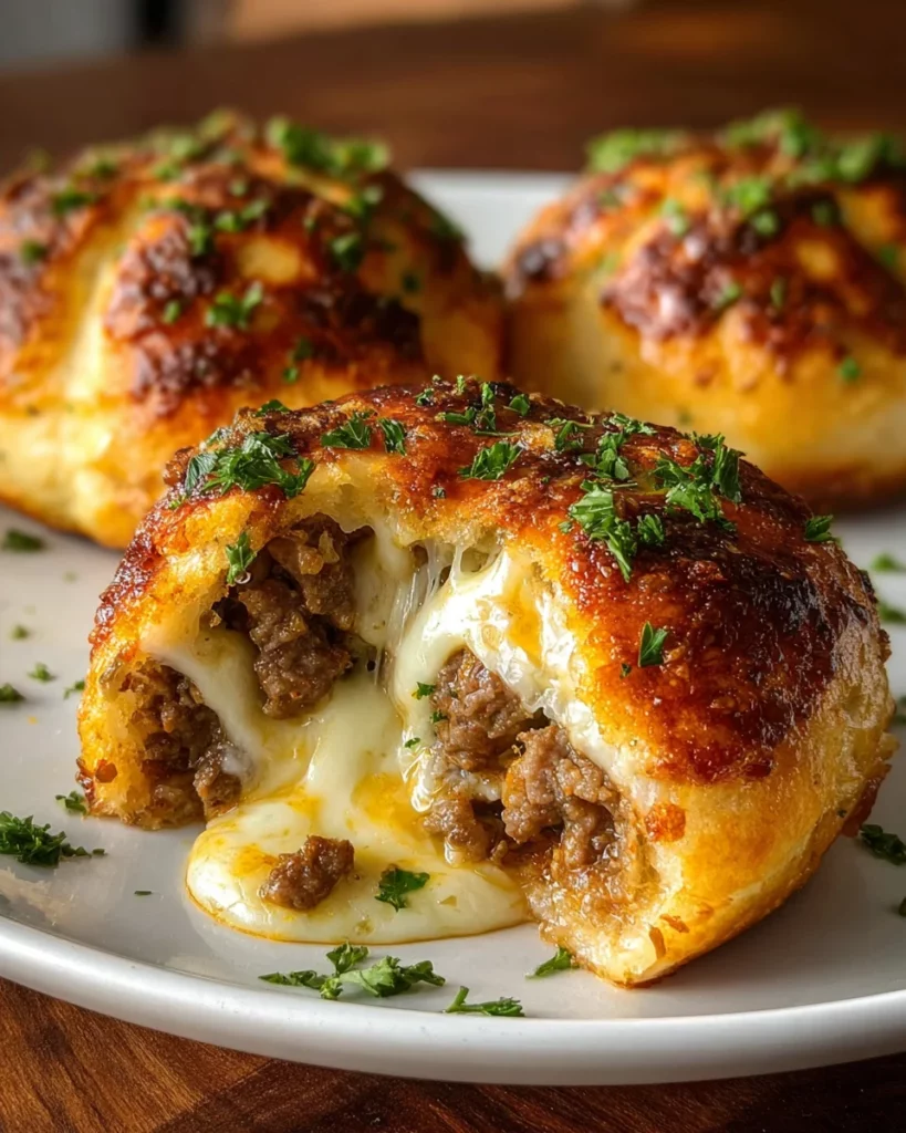 Garlic Parmesan Cheeseburger Bombs are a delightful appetizer featuring seasoned ground beef and gooey mozzarella cheese wrapped in flaky biscuit dough, topped with garlic butter and Parmesan.