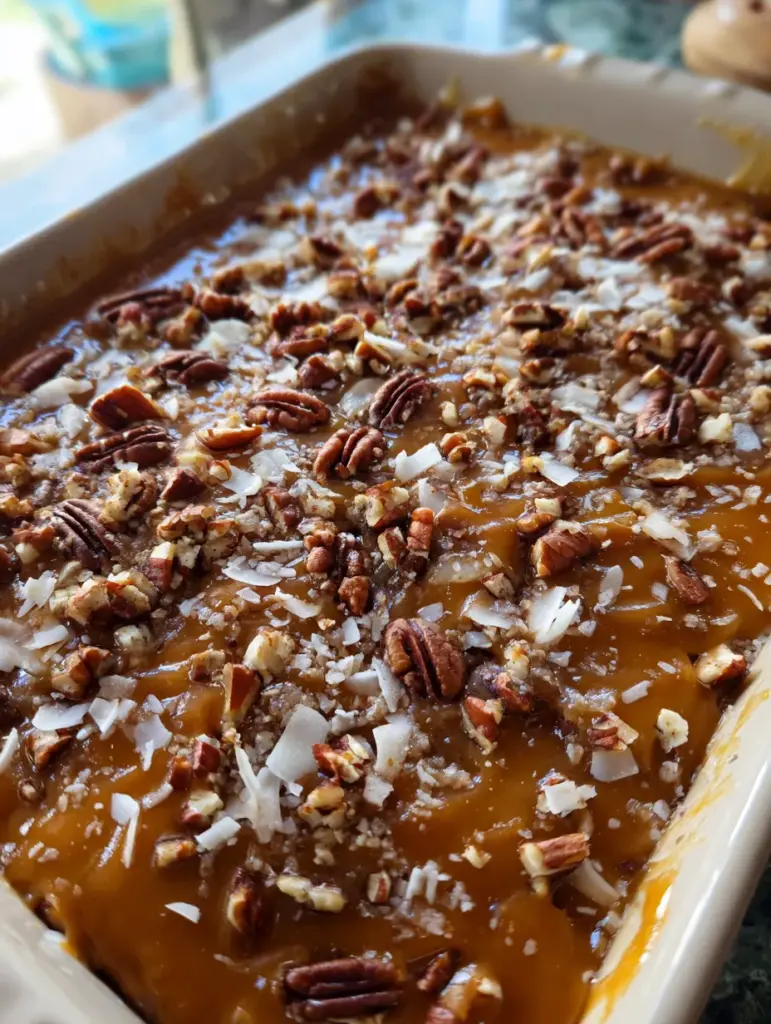 The topping isn’t rushed or skimpy. The caramel is thick, not syrupy. The pecans are generous. The coconut is sweet and chewy, sticking to the caramel just like in the image. And that final pour of warm caramel before serving? That’s what gives the cake its signature look — glossy, dripping, and irresistible.