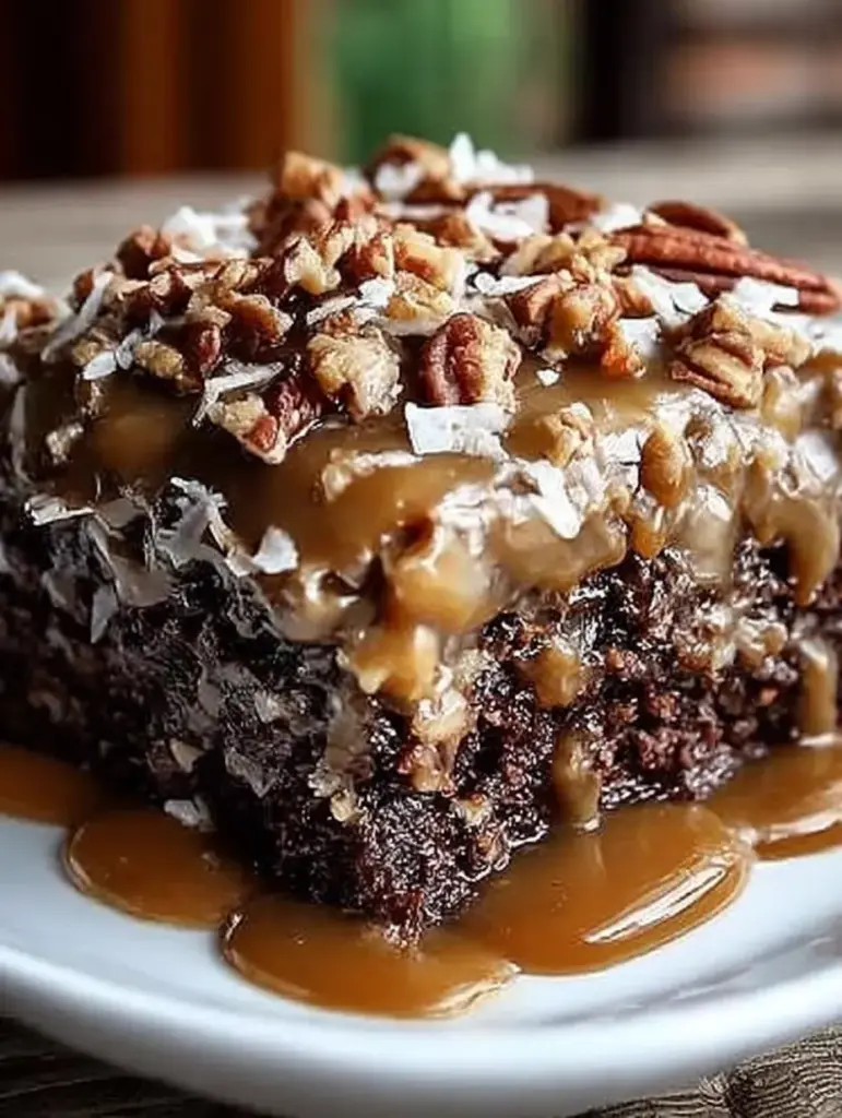 🍫🥥 A rich, ultra-moist German chocolate cake soaked with creamy caramel and sweetened condensed milk, then finished with coconut, pecans, and silky chocolate drizzles. Every bite is gooey, indulgent, and absolutely irresistible! ✨🍰