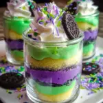 Ghoulishly Fun Beetlejuice Mini Trifles are a delightful Halloween dessert featuring layers of vibrant green and purple cake, creamy filling, and crunchy cookie layers.