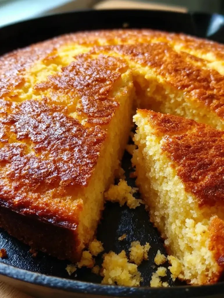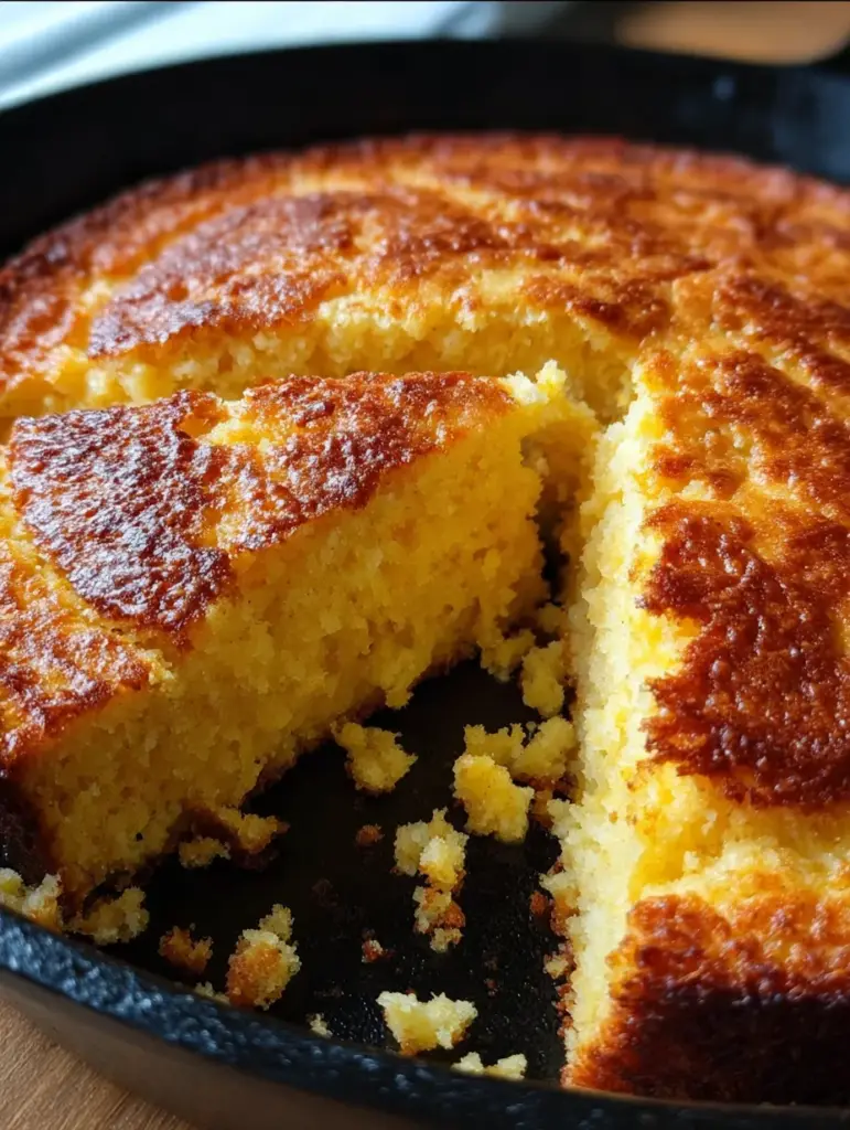 This is the kind of cornbread that looks exactly like the image you shared — thick, rustic, deeply golden on top, with a slightly cracked surface and a buttery sheen. A wedge is cut out, crumbs scattered casually in the skillet, because nobody waits long enough for perfection. It’s warm. It’s inviting. It’s real.