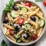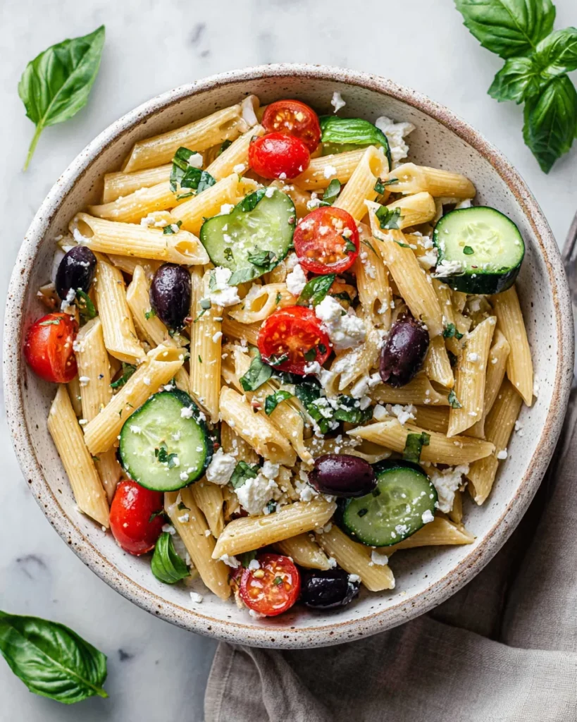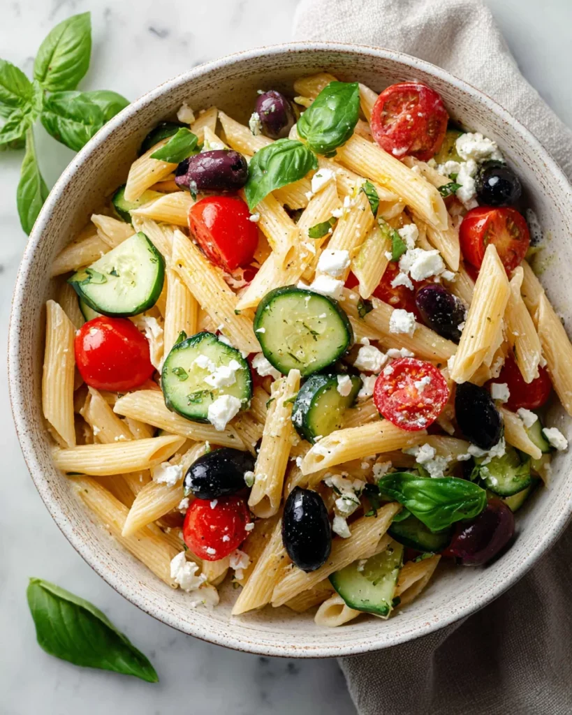 A refreshing Greek summer pasta salad perfect for any occasion, combining pasta with fresh vegetables and feta cheese.