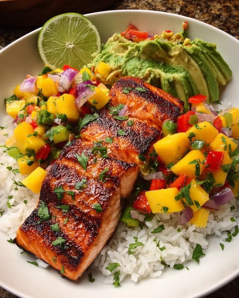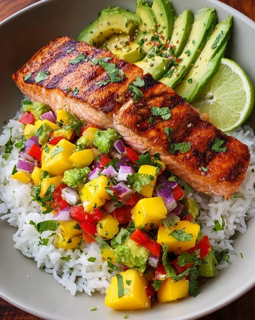 A delicious and tropical dish featuring grilled salmon topped with a refreshing avocado-mango salsa, served alongside coconut rice.