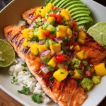 Now, for the grand finale! Serve your grilled salmon warm, laying it on a bed of fluffy coconut rice. Top it generously with that vibrant mango avocado salsa. Look at those colors! It’s not just a feast for the belly; it’s a feast for the eyes.