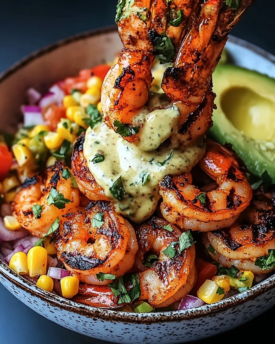 Introduction to Grilled Shrimp Bowl with Avocado Corn Salsa Creamy Sauce