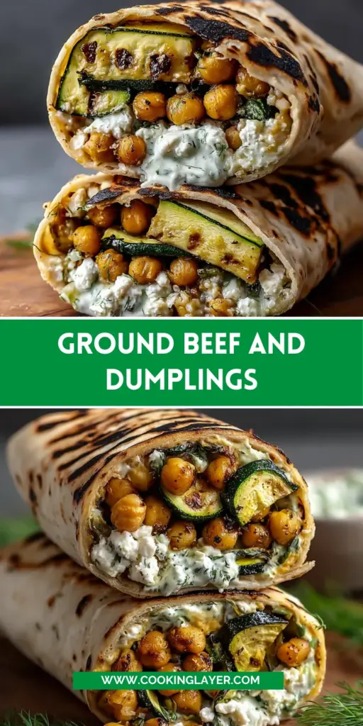 A delicious and healthy wrap featuring grilled zucchini, feta cheese, and chickpeas, complemented by a flavorful herbed yogurt sauce.