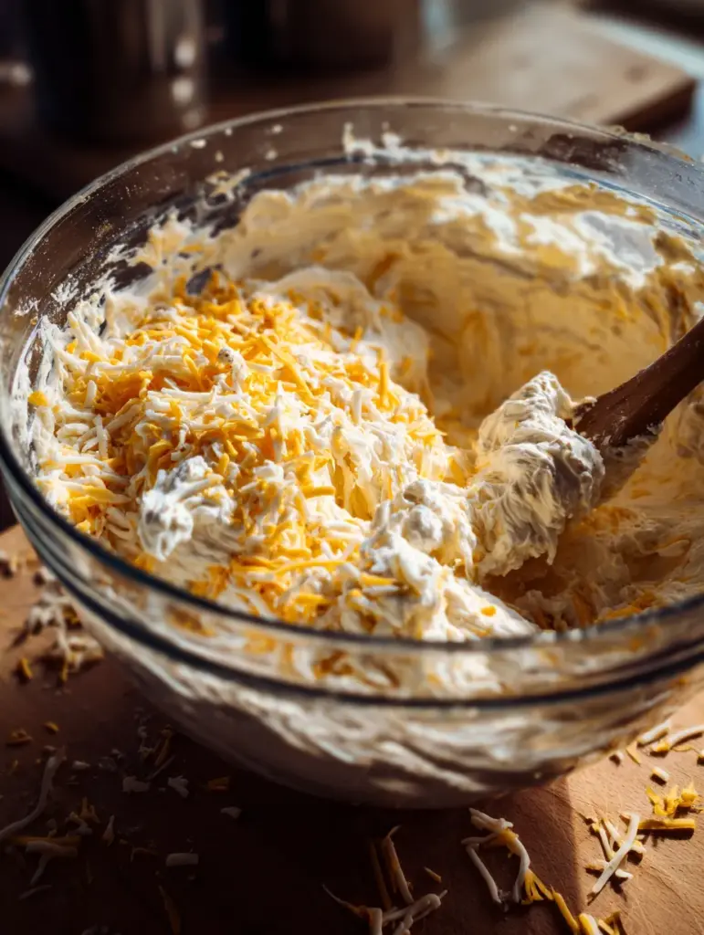 Add the cheddar, mozzarella, sour cream, garlic powder, onion powder, salt, and pepper. Mix until it’s completely creamy—don’t leave any pockets of unmixed cheese!