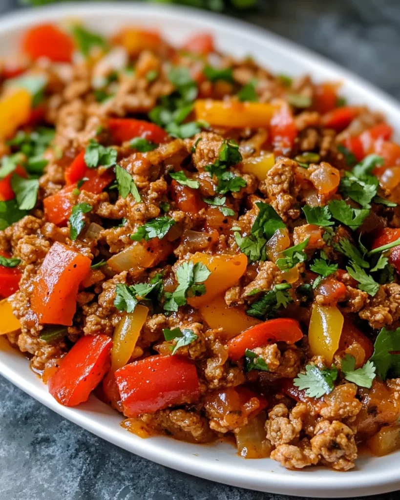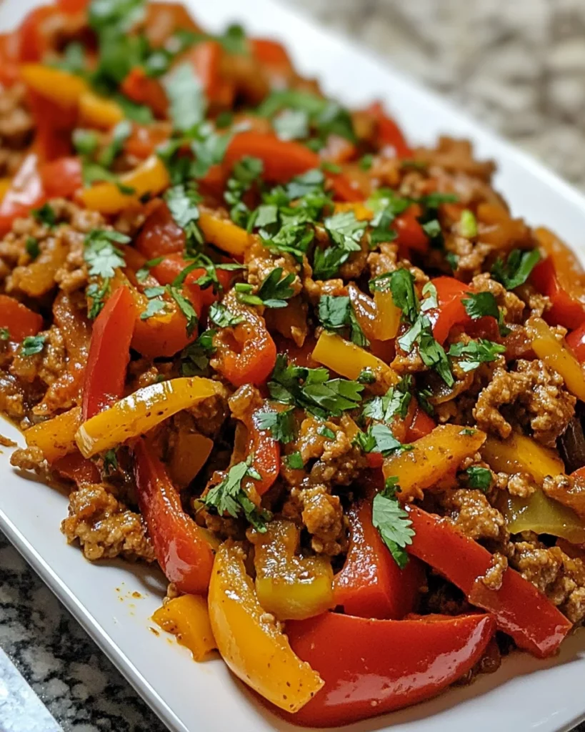 A flavorful dish featuring ground turkey and colorful bell peppers, perfect for a quick and healthy meal.