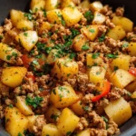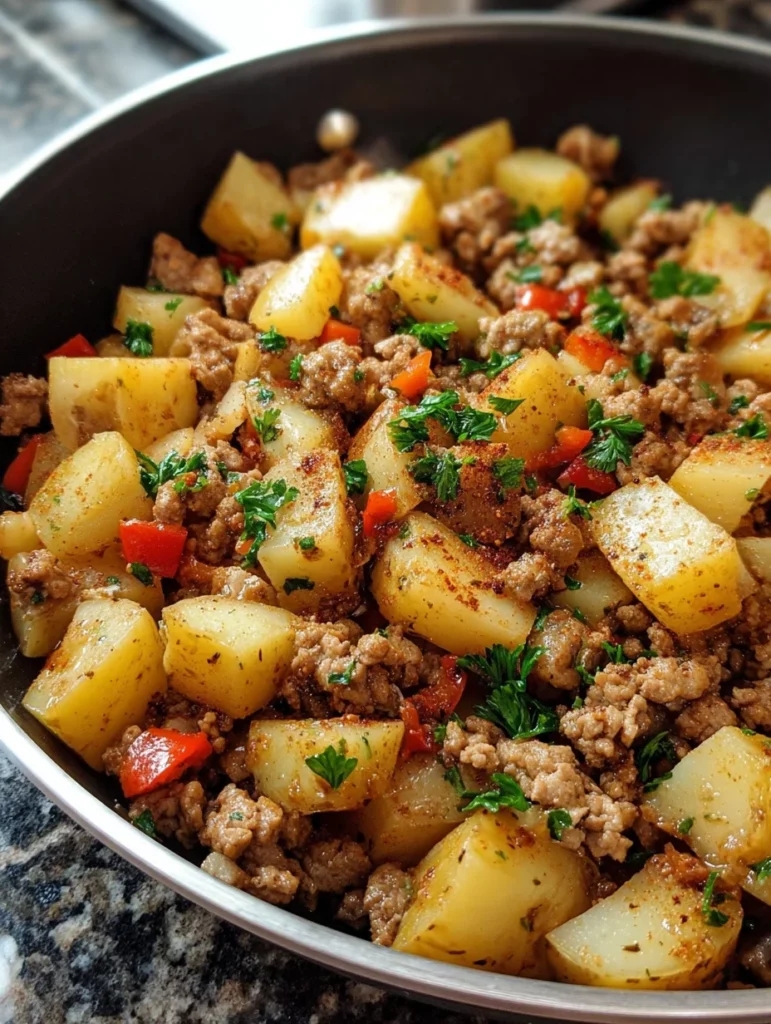 A delicious one-pan meal featuring ground turkey and potatoes, perfectly seasoned and cooked to perfection.