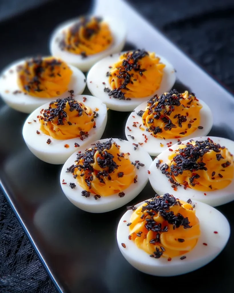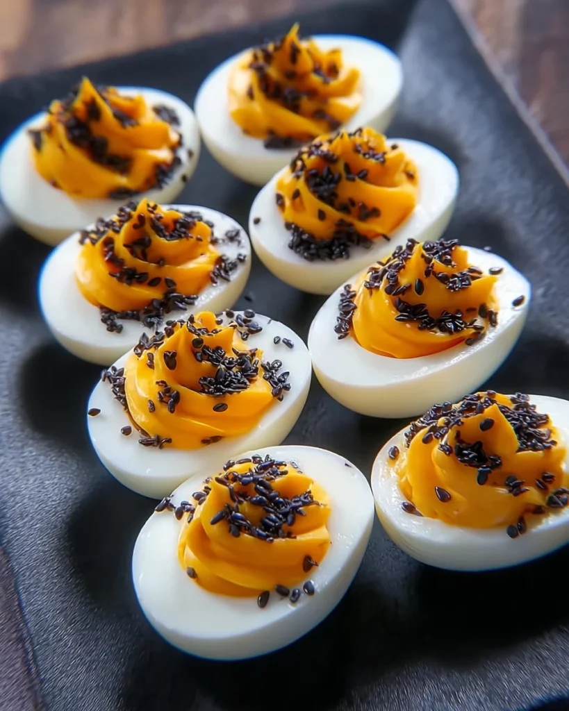 Almost there! Sprinkle some black sesame seeds on top for that spooky finishing touch. Not only do they look fantastic, but they add a nice crunch too! Now, chill the eggs in the fridge until you’re ready to serve. They’ll be the hit of your Halloween celebration!