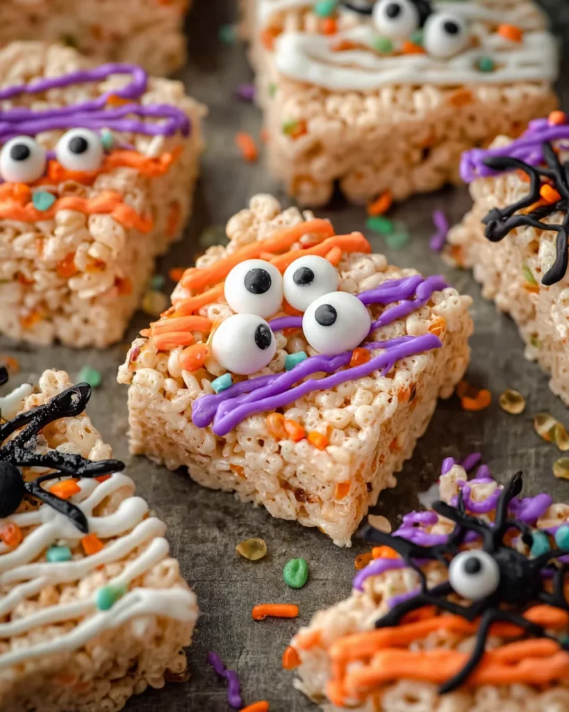 - To Decorate: For Mummy Treats, drizzle white candy melts in a crisscross pattern over the Rice Krispie squares. While the candy melt is still wet, place two candy eyes on each square for the mummy face. For Ghost Faces, spread melted white candy melts over the top of each square to create a ghostly base, and add two chocolate chips for eyes and one for the mouth. For Spiderwebs, melt dark or milk chocolate and drizzle it in a spiral pattern on top of the squares. Use a toothpick to drag lines outward from the center to create a spiderweb design.