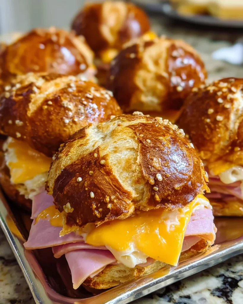 Delicious ham and cheese sliders made with pretzel buns, perfect for a snack or party.