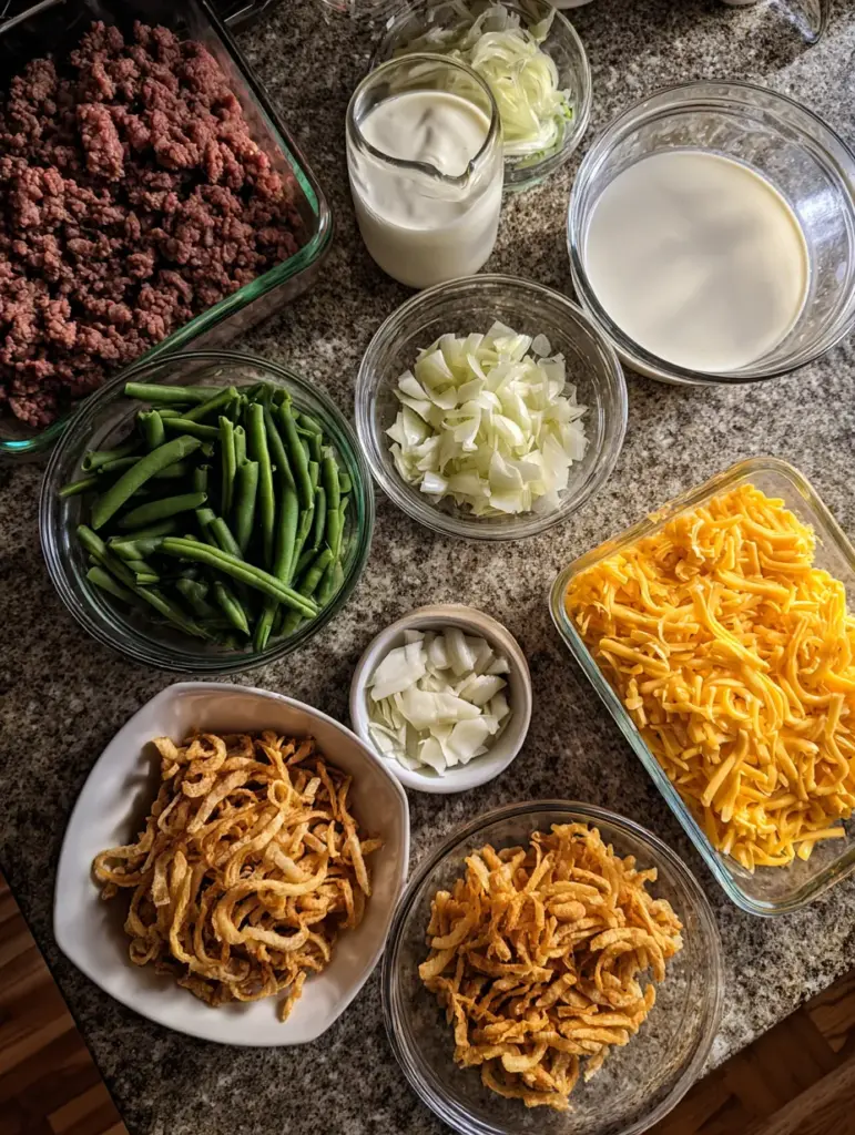 This isn’t your average weeknight casserole. What makes this dish extra addictive is the way each element plays its part perfectly. You’ve got savory, juicy ground beef cooked with onion and garlic. That beef gets coated in a luscious mushroom-cream sauce and layered with green beans that still have a bit of snap. And then… the cheese. Ooey, gooey cheddar and mozzarella melt right into every layer. Finally, it’s all topped off with crispy fried onions that stay golden and crunchy — just like the photo.