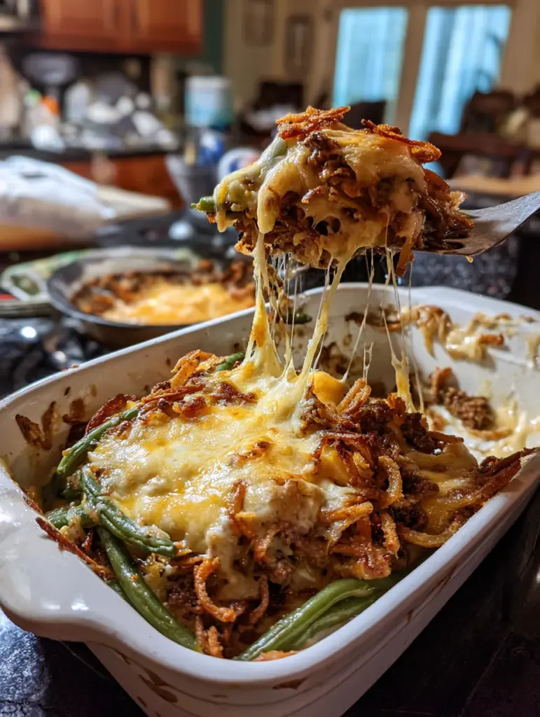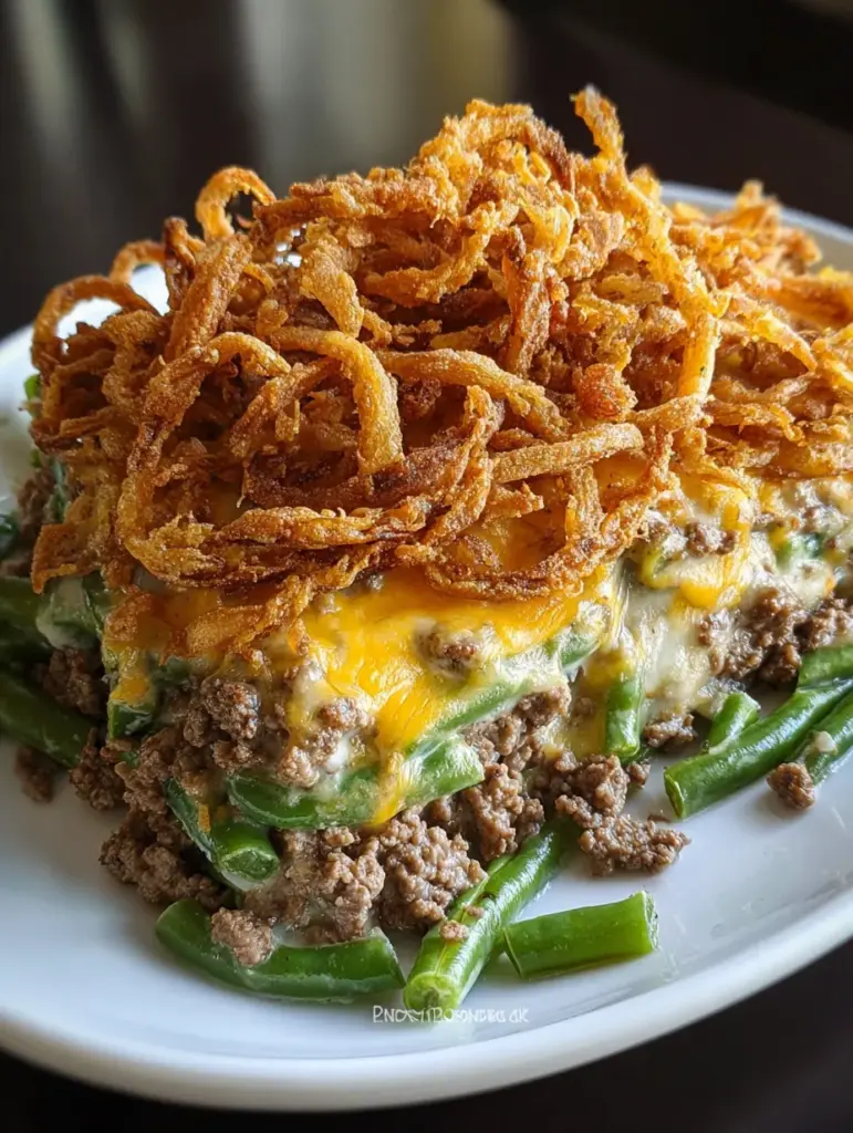 We’re talking about rich layers of seasoned ground beef, tender green beans, a super creamy cheese sauce, and a mountain of golden, crunchy onions on top. And best of all? It’s easy to make, uses simple ingredients, and serves up major nostalgia with every bite. If you grew up loving green bean casserole during the holidays, this version will blow your mind — it’s beefed-up, cheesed-up, and loaded with texture.