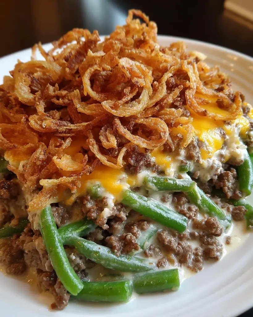 A delicious and quick casserole combining ground beef, green beans, and crunchy French fried onions, topped with melted cheddar cheese.