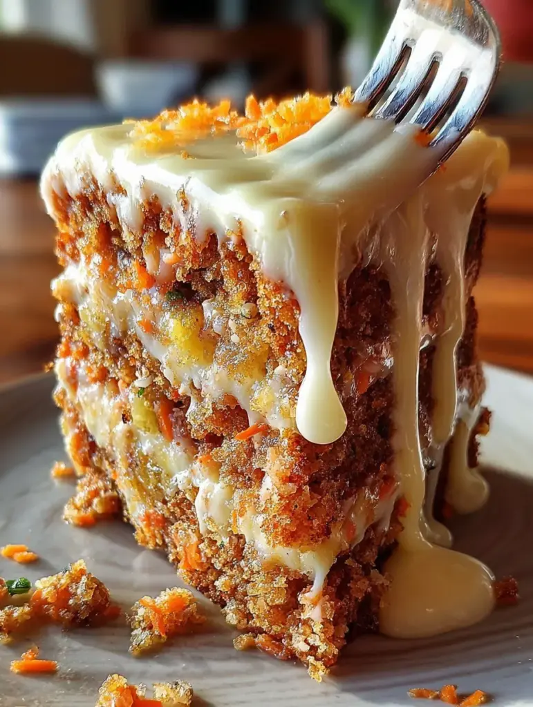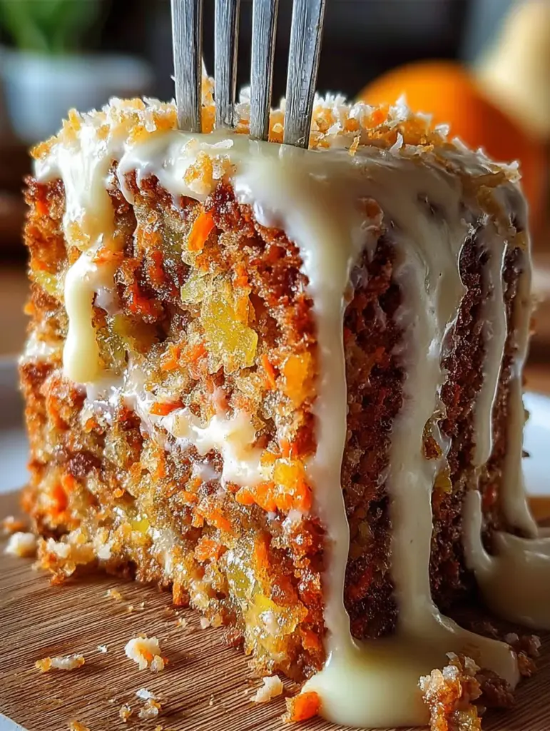 A tall, moist, tropical carrot cake dripping with glossy cream cheese glaze — perfectly matching the image you provided.