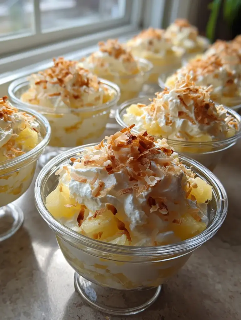 And best of all? It looks GORGEOUS when served in a glass dish, just like the one in the image above. Fluffy mounds, golden coconut, and yellow pineapple peaks—it’s dessert art.