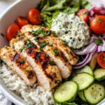 It’s time to put it all together! Start with a base of fluffy white rice in each bowl. Next, add a generous handful of shredded romaine and a colorful array of cherry tomatoes and cucumber. Slice the chicken and place it on top, followed by a dollop of tzatziki.