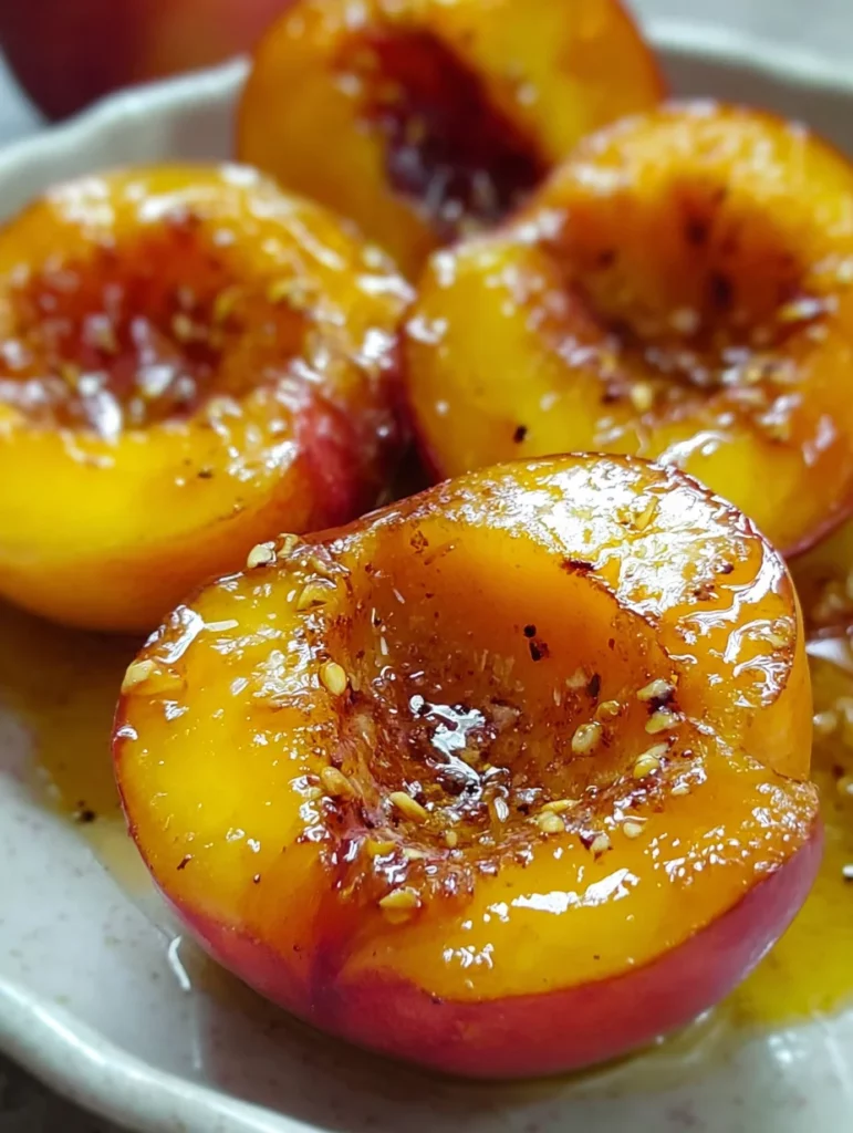 A sweet and healthy dessert made with roasted peaches drizzled with honey and warm spices.