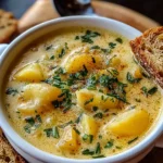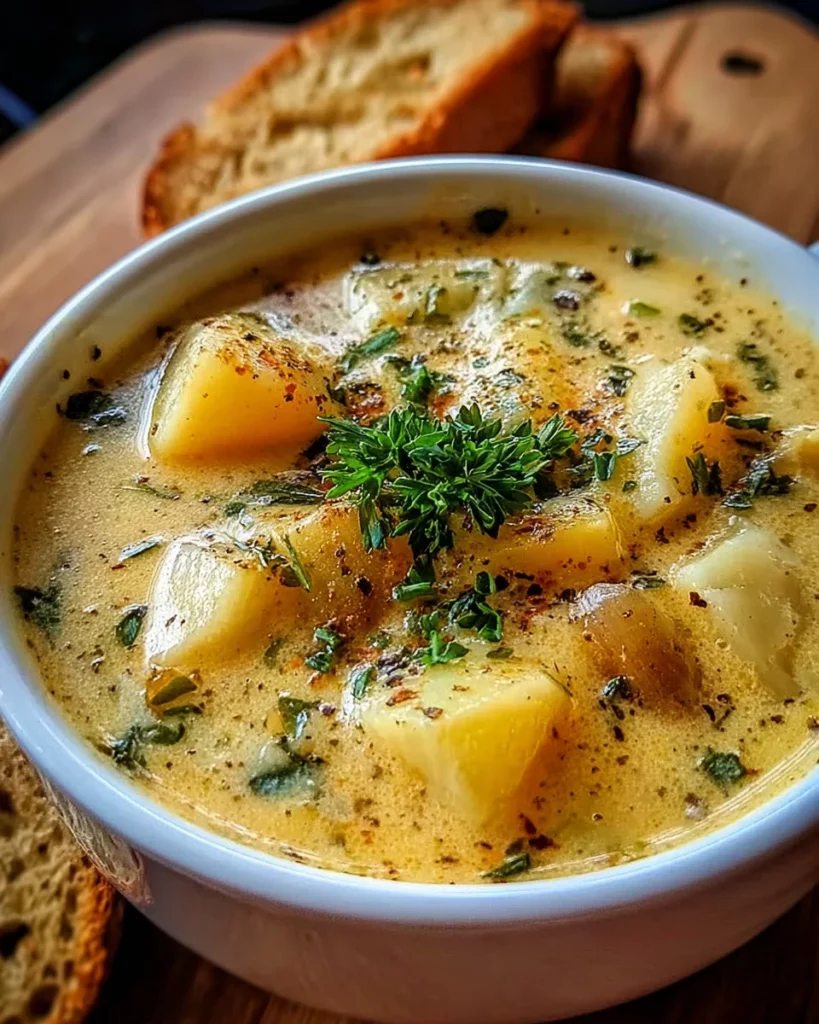 A creamy and hearty potato soup infused with cheddar cheese, garlic, and fresh herbs, perfect for a comforting meal.