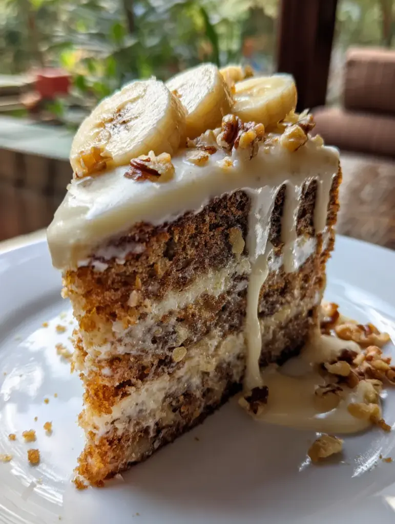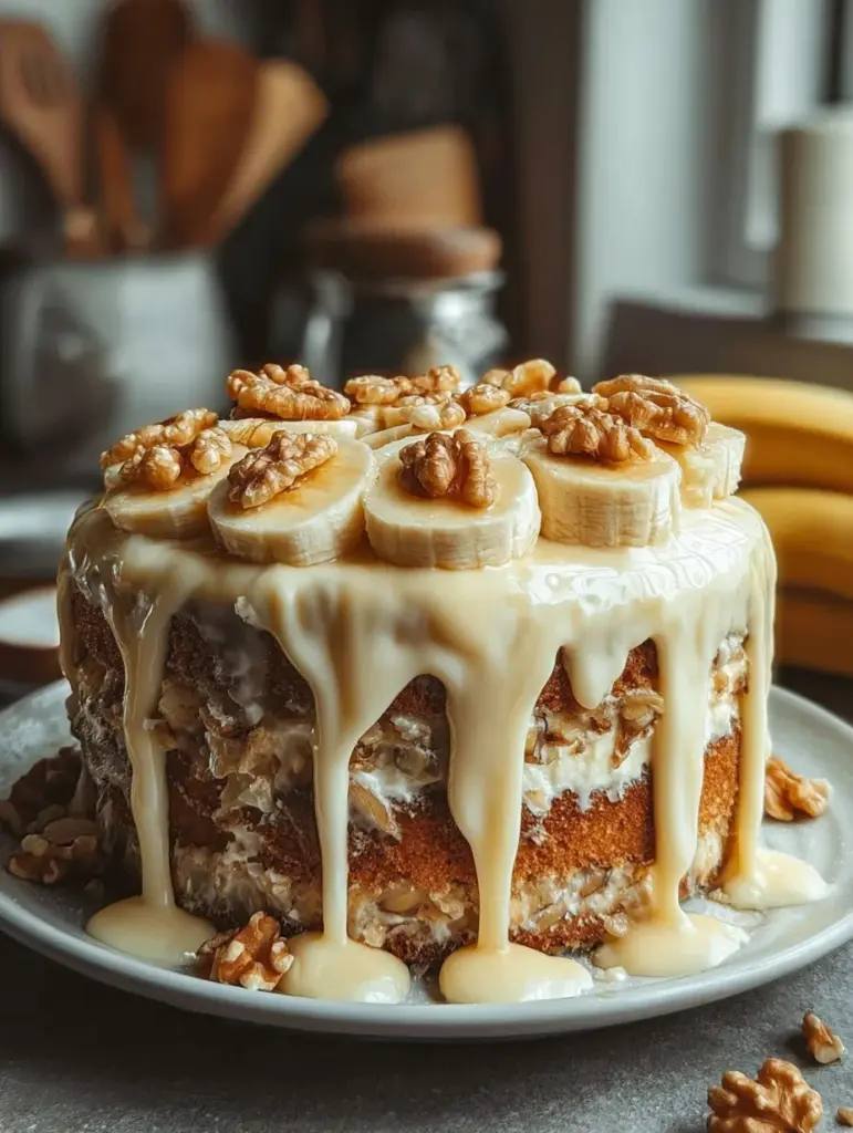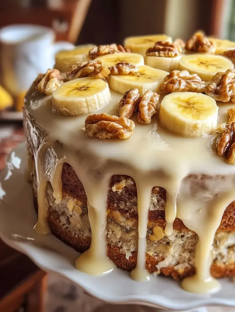 Arrange the banana slices neatly on top, drizzle that glossy cream frosting, and sprinkle the walnuts for texture and contrast. The combination of creamy white frosting, golden cake, and caramel-brown nuts makes it look simply irresistible — exactly like the image you shared.