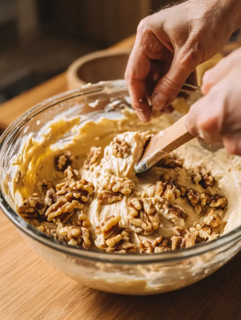 Once that’s done, fold in 1 cup of chopped toasted walnuts. Use a rubber spatula and make gentle folding motions to keep the air in the batter. These nutty bits are the surprise crunch in every bite, balancing the soft, moist cake with texture and flavor.