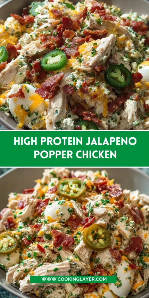 High Protein Jalapeno Popper Chicken is a flavorful dish packed with protein, combining shredded chicken, bacon, jalapeños, and a creamy cheese mixture.
