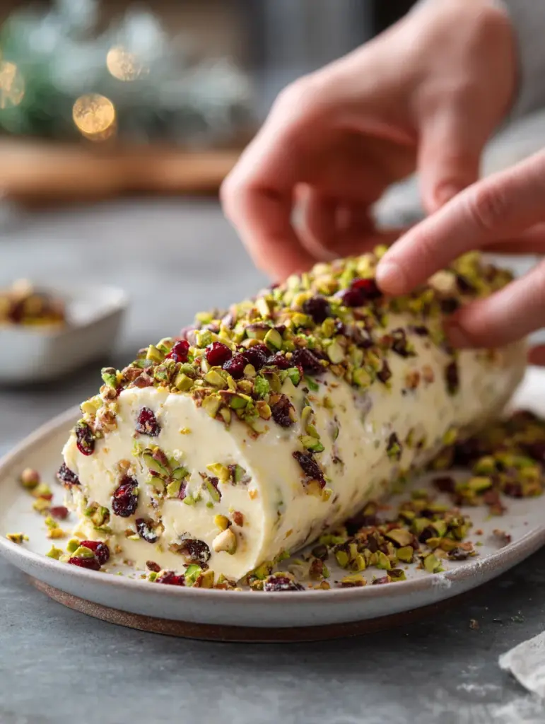 Unwrap the chilled log and gently roll it in the pistachio-cranberry mixture, pressing lightly so it adheres (3 minutes). 🌰✨