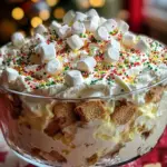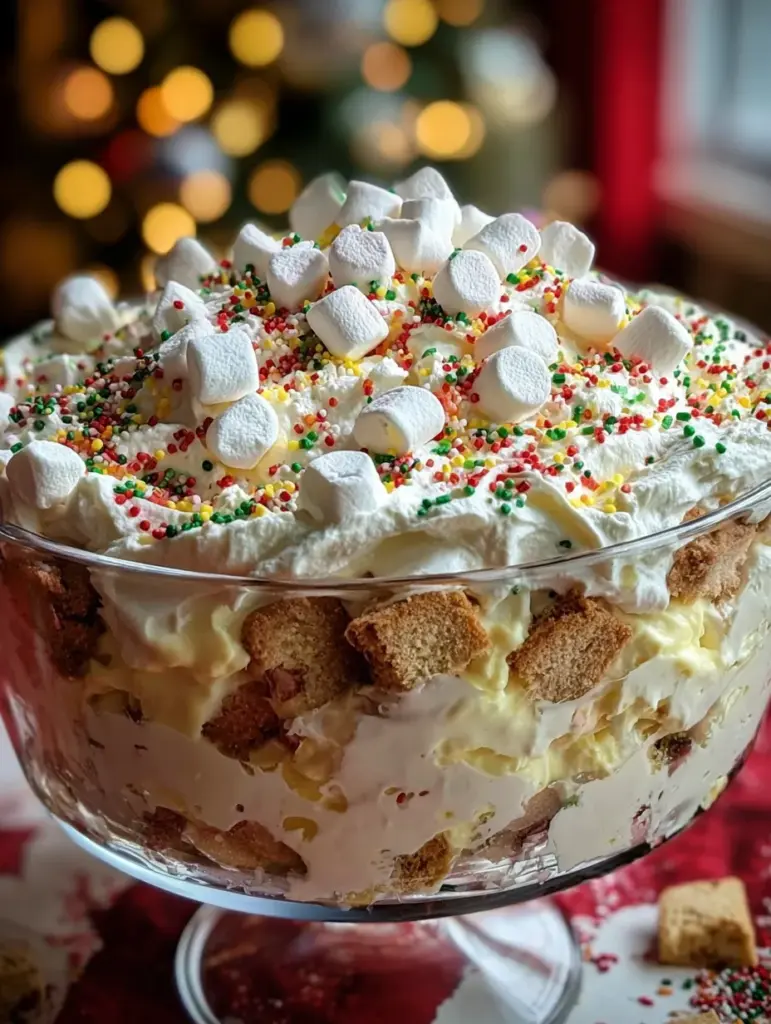 Just before serving, sprinkle more crushed cookies, mini marshmallows, and holiday sprinkles on top. For extra drama, pile it high like a whipped snow mountain!