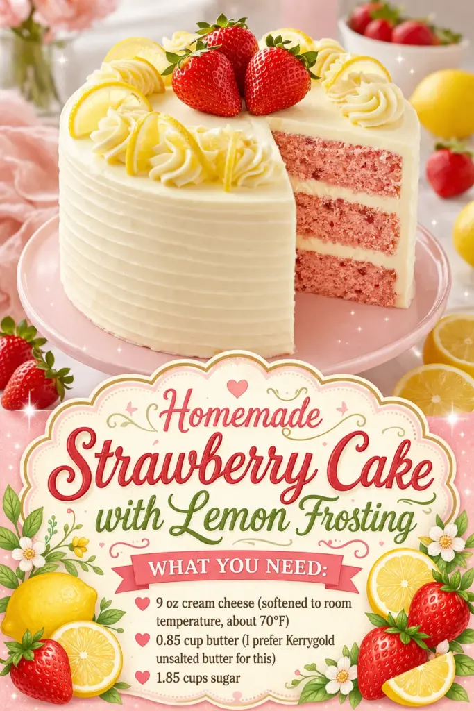 A delightful Homemade Strawberry Cake layered with lemon frosting, perfect for any celebration.