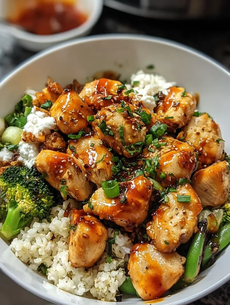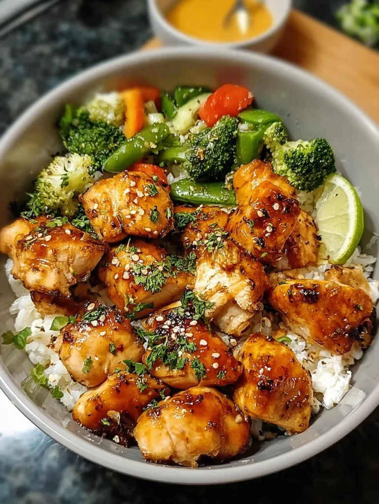A delicious Hot Honey Chicken Bowl featuring sweet and spicy flavors with tender chicken, rice or quinoa, and vibrant vegetables.