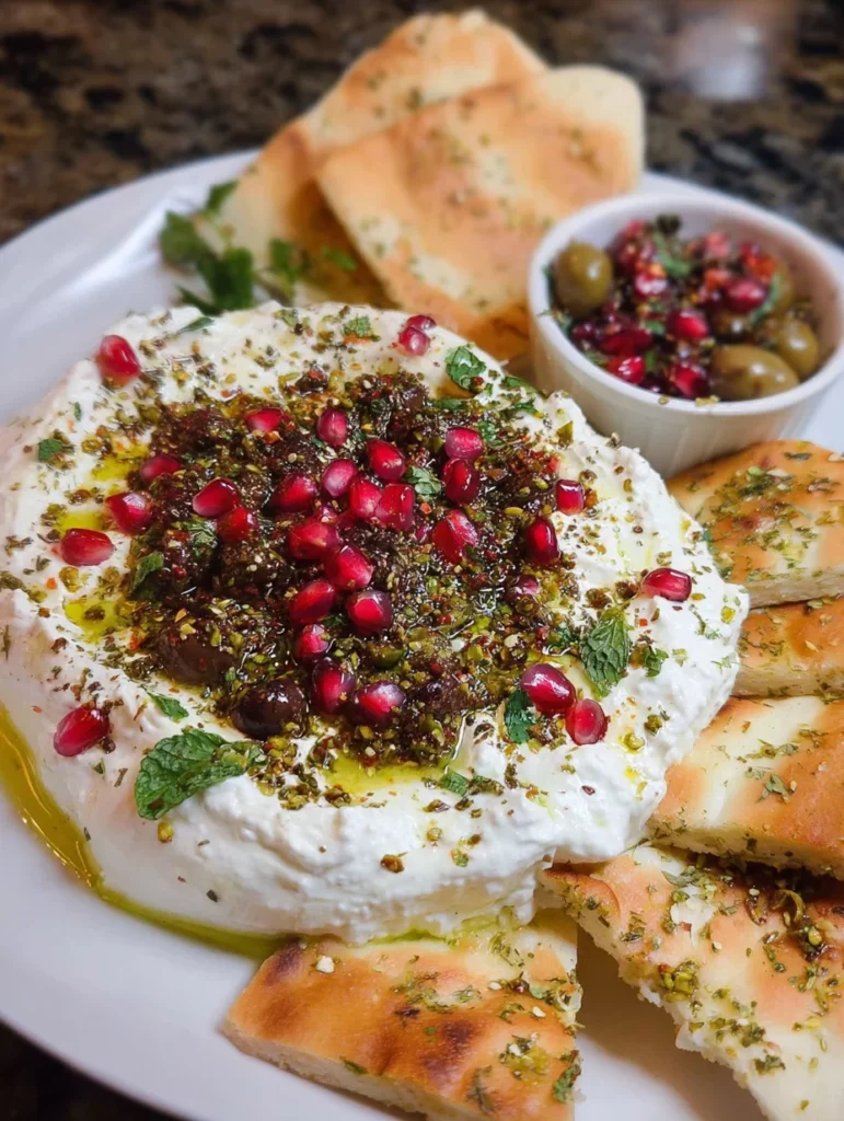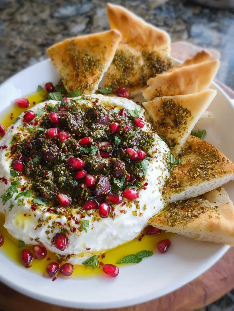 A flavorful Labneh Dip topped with olives and served with crispy Zaatar Pita Chips, perfect for gatherings or as a healthy snack.