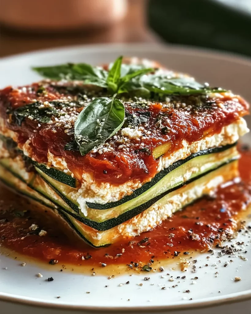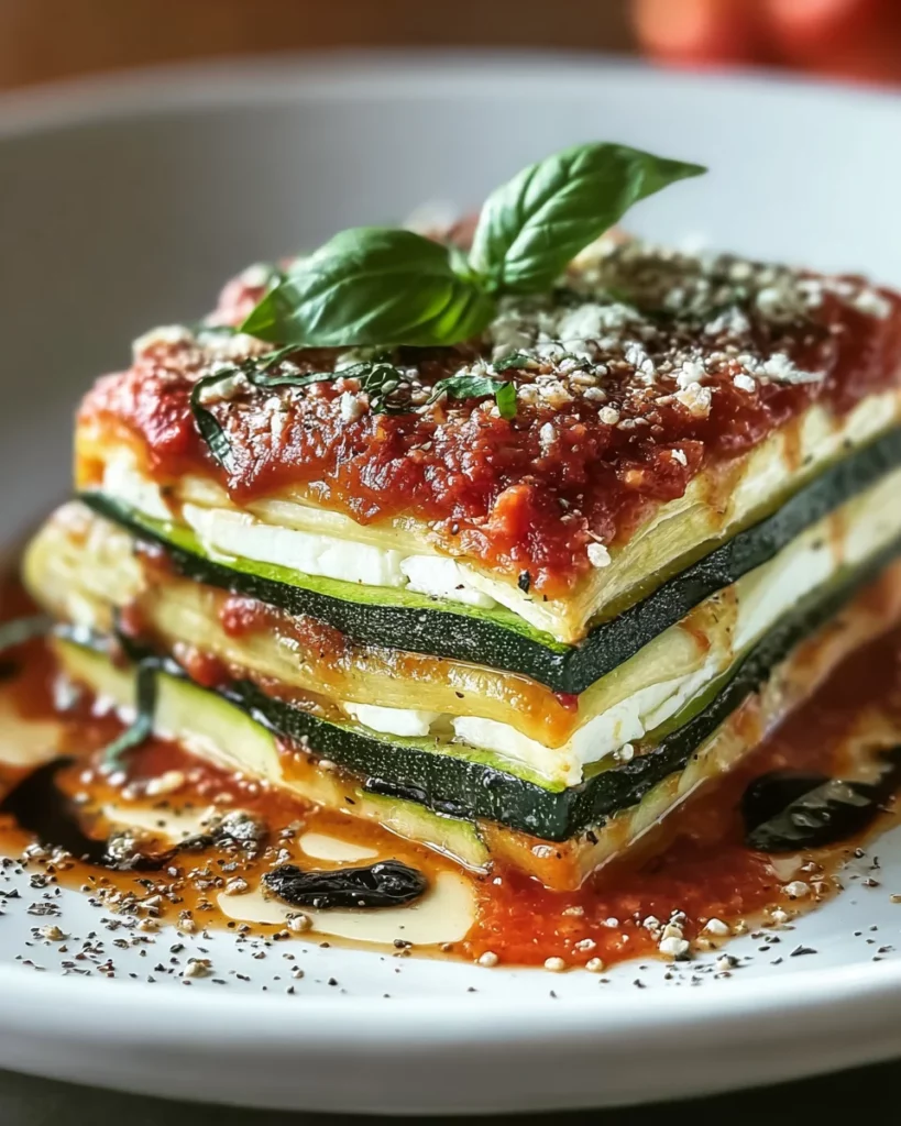 A delicious layered dish featuring zucchini, ricotta cheese, and marinara sauce, perfect for dinner.