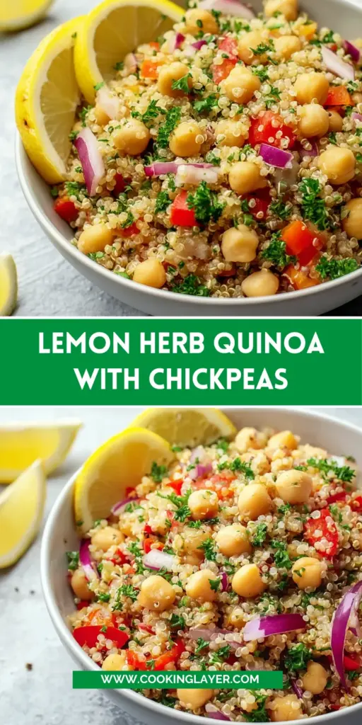 Preparing Lemon Herb Quinoa with Chickpeas has been a delightful journey in my kitchen. Not only does this dish burst with flavor, but it also nourishes the body with its wholesome ingredients. Whether I’m serving it for a quick lunch or as a side at dinner, this recipe never fails to bring smiles to my family’s faces. The vibrant colors and fresh herbs make it a feast for the eyes too! I hope this meal brings you as much joy and satisfaction as it has brought to my own kitchen adventures. Enjoy every bite!