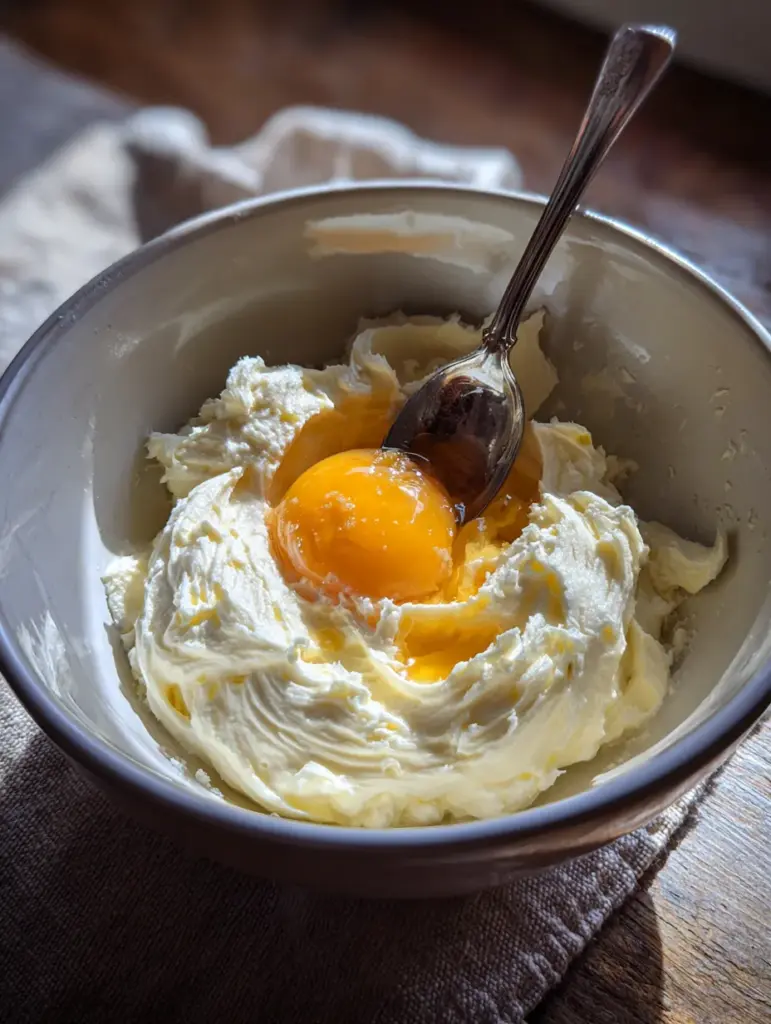 - Add Egg Yolk + Vanilla – Mix them in until fully incorporated. Don’t rush — give it a full minute to blend beautifully.