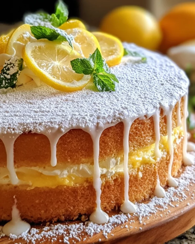 - Drizzle the limoncello glaze over the top, letting it drip down the sides. Dust with powdered sugar, garnish with lemon slices, zest, and fresh mint. Serve chilled.