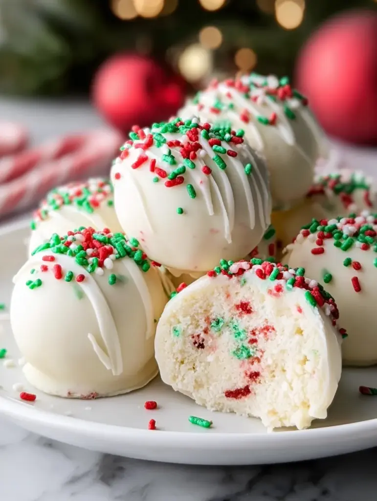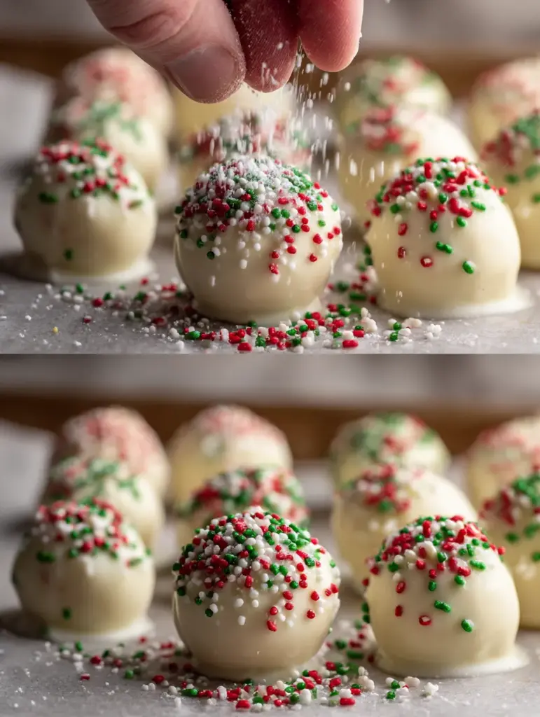 Now take that magic, crumble it up, mix it with cream cheese, roll it into bite-sized balls, dip in silky white chocolate, and finish with festive sprinkles. What you get is a treat that looks like a truffle, tastes like a cake-pop, and delivers pure holiday happiness in one bite.