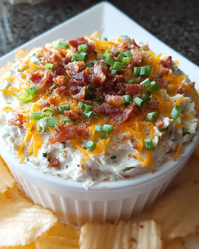 A creamy and flavorful dip that combines the classic tastes of loaded baked potatoes in a delicious, shareable format. Perfect for parties or gatherings.