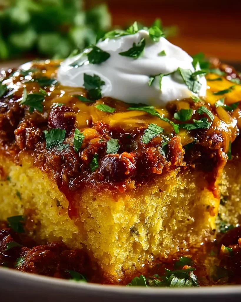 A delicious and hearty Loaded Chili Cheese Cornbread Bake perfect for any occasion.