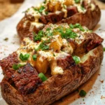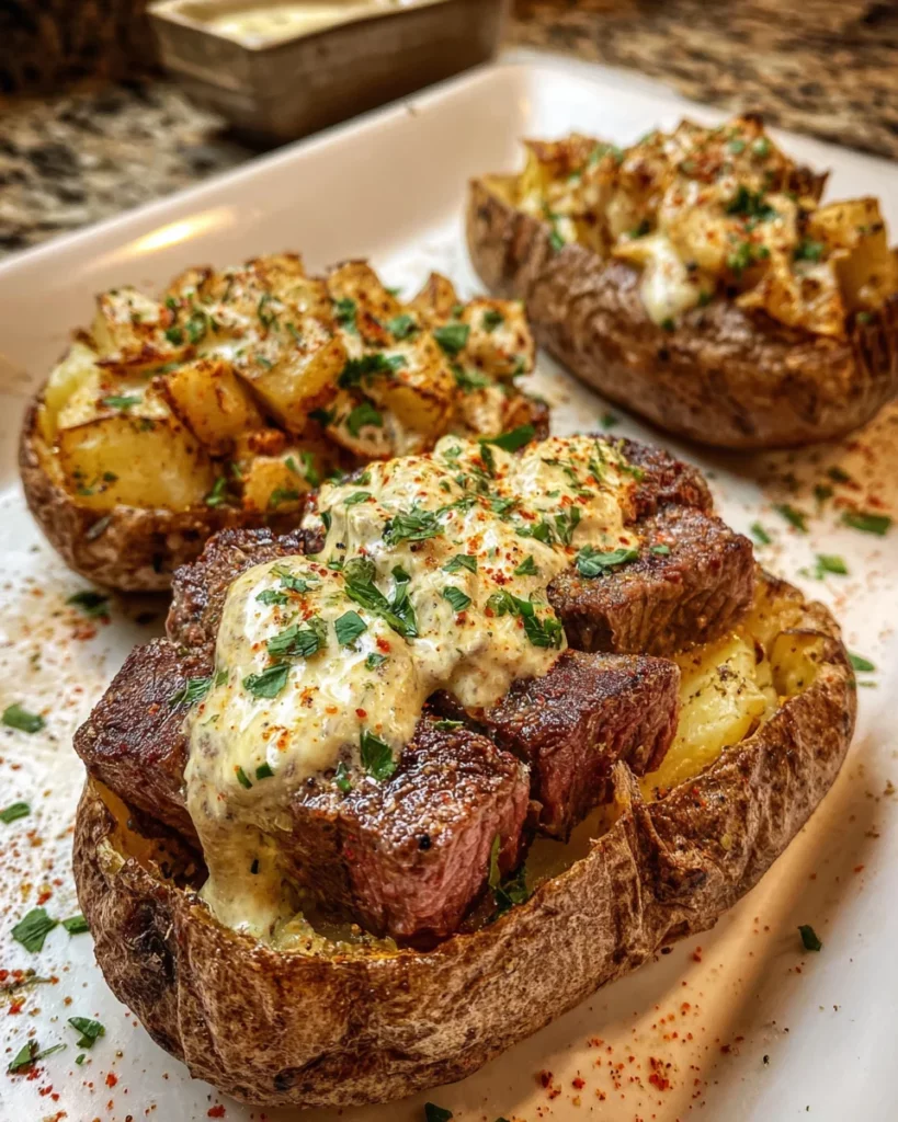 Loaded Steak Potato is a delicious recipe featuring tender steak and creamy parmesan sauce stuffed inside baked russet potatoes, perfect for a satisfying meal.