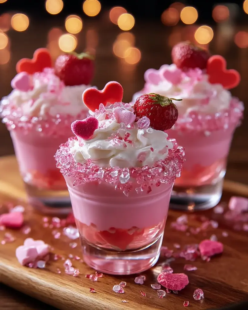 - Just before serving, top each shot with a heart-shaped candy and a sprinkle of edible glitter for that irresistible sparkle.