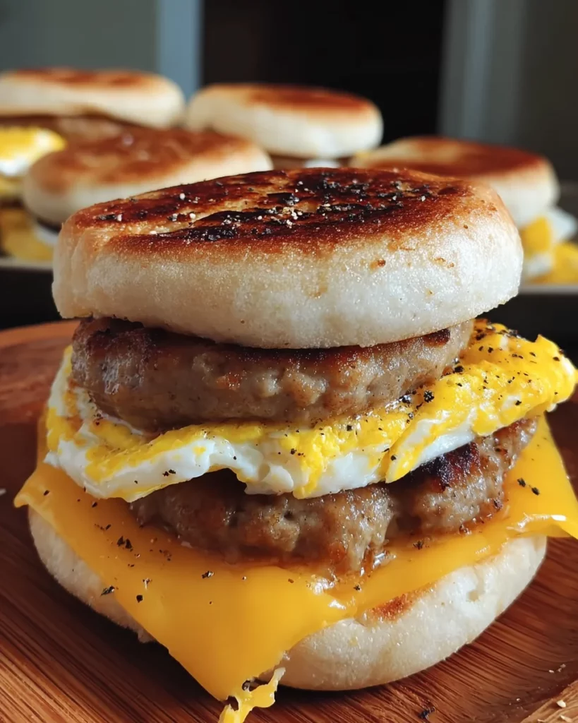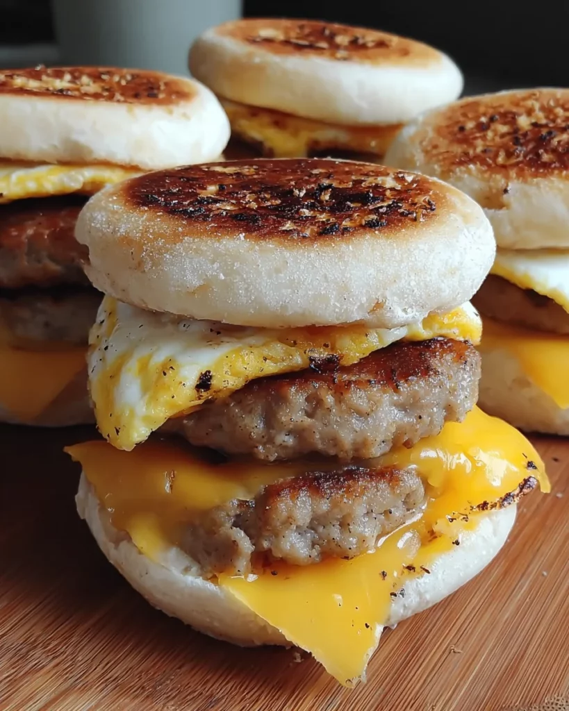 A homemade version of McDonald’s Sausage Egg Cheese, featuring layers of egg, sausage, and cheese on a toasted English muffin.