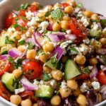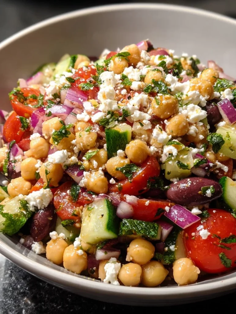 A refreshing Mediterranean chickpea salad with feta cheese, packed with fresh vegetables and herbs.