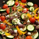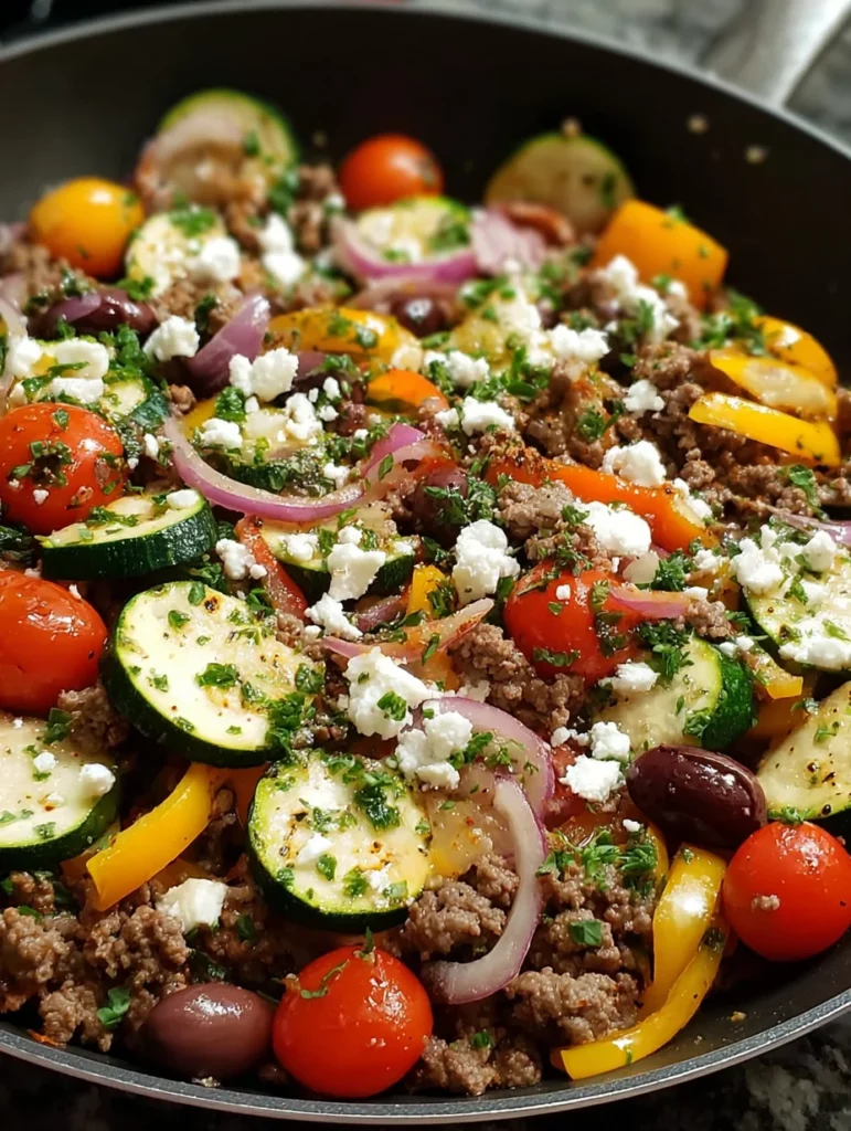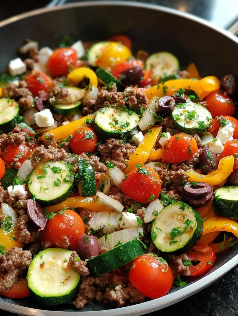 A delicious and easy one-pot Mediterranean ground beef stir fry that combines the flavors of fresh vegetables, herbs, and spices in a quick dish.