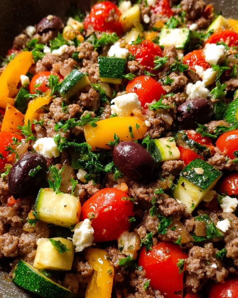 A quick and delicious Mediterranean-inspired stir-fry featuring ground beef, colorful vegetables, and fresh herbs.