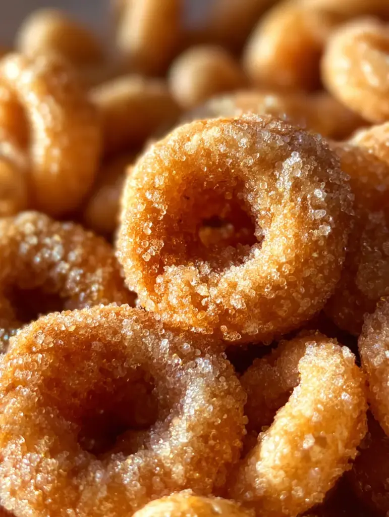 The image shows exactly what you want to aim for: evenly coated Cheerios with a light golden sheen, not soggy, not dry. Each piece looks like a tiny donut ring dusted in cinnamon sugar, with no clumps and no bare spots.